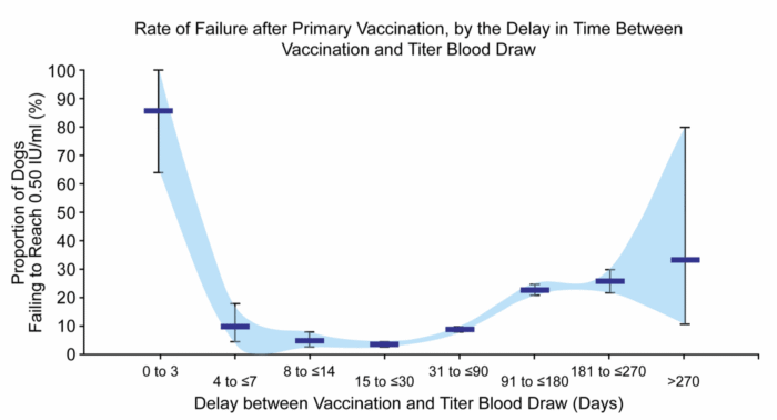 Vaccines stimulate the body to produce antibodies. That’s not instantaneous. When a dog get its first rabies vaccine, it can take a little while for antibodies to be detectable, and the levels will rise for a short time. (With subsequent boosters, the response is much quicker). The median time from vaccination to sampling was 42 days, which is lots of time. The timeframe was a low as 3 days, though. It wouldn’t be surprising to find low or undetectable titres in a dog vaccinated for the first time 3 days earlier but the vaccine response ramps up quickly, as shown in the graph below from the Wallace et al paper. So, I doubt timing was a significant factor here.